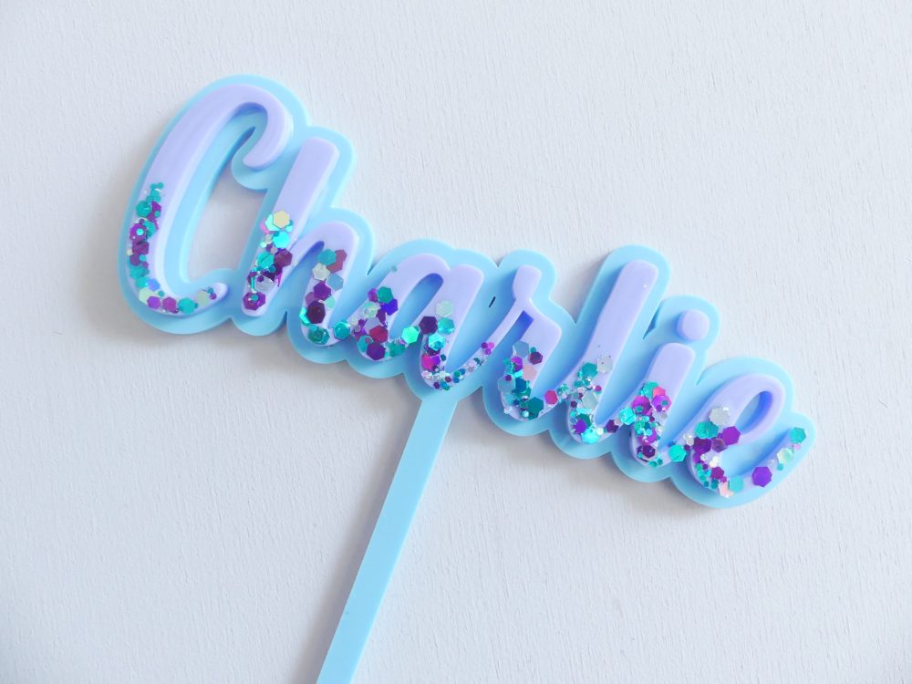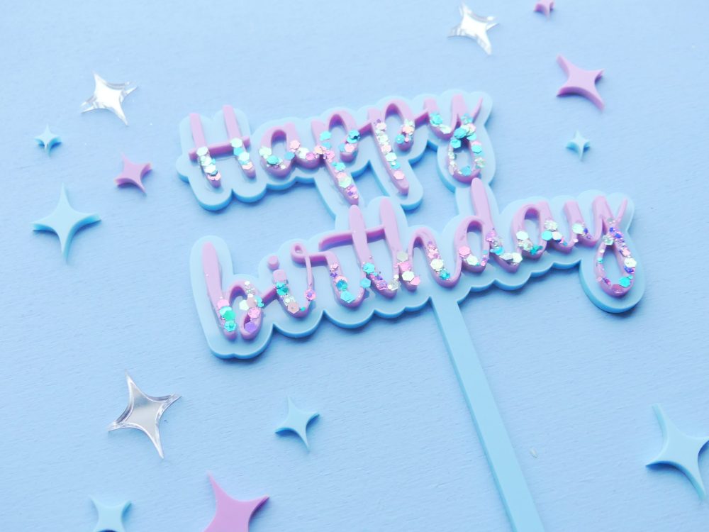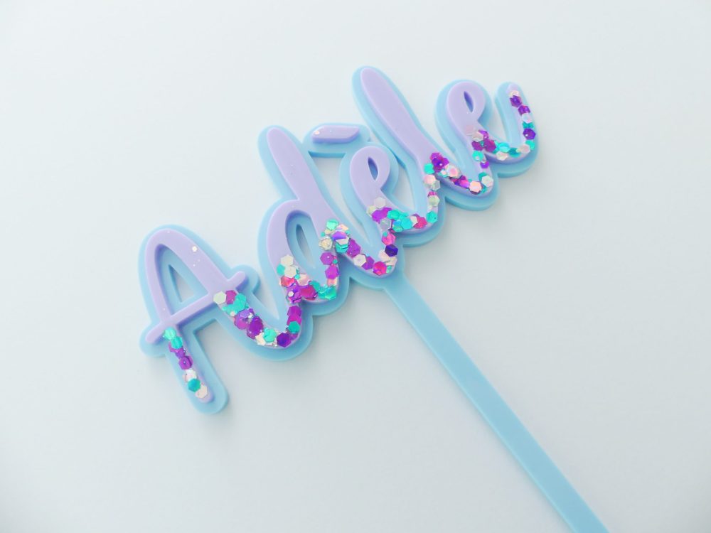 Un joli topper aux couleurs pastels bleu et lavande, paillettes assorties (turquoise,violet et argent)