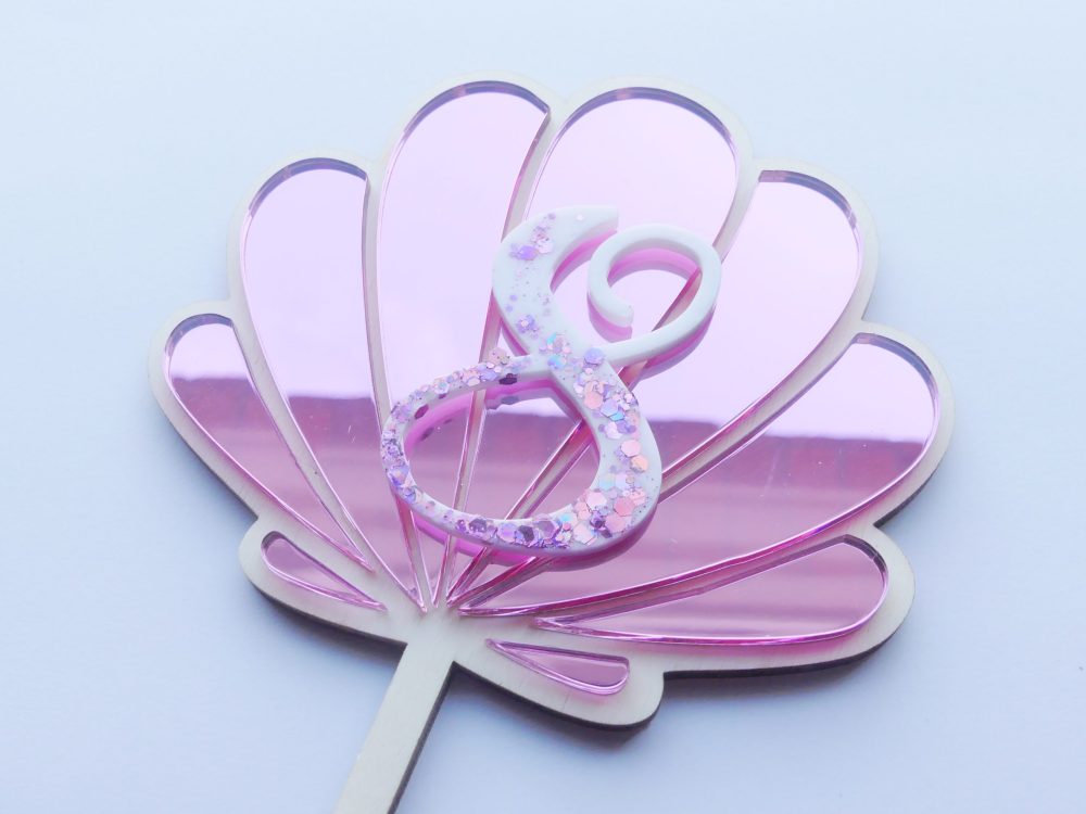 Un topper coquillage en relief de couleur miroir rose avec l’ âge de votre choix pailleté !